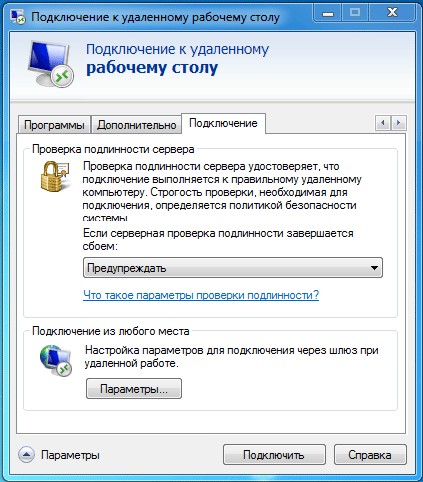 После удачного подключения советуем изменить опцию Предупреждатьна закладке Подключение - Проверка подлинности сервера на Не соединять, разрешив таким образом подключения только к доверенным серверам.