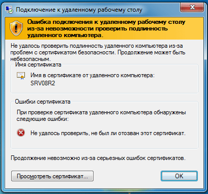 В Windows 7 (при использовании RDP клиента версии 7) данный сертификат требуется установить в хранилище учетной записи компьютера, для этого импортируйте его через оснастку Сертификаты (локальный компьютер) в консоли MCC, аналогично тому, как это делали выше. В противном случае подключение будет невозможно и вы получите следующую ошибку: