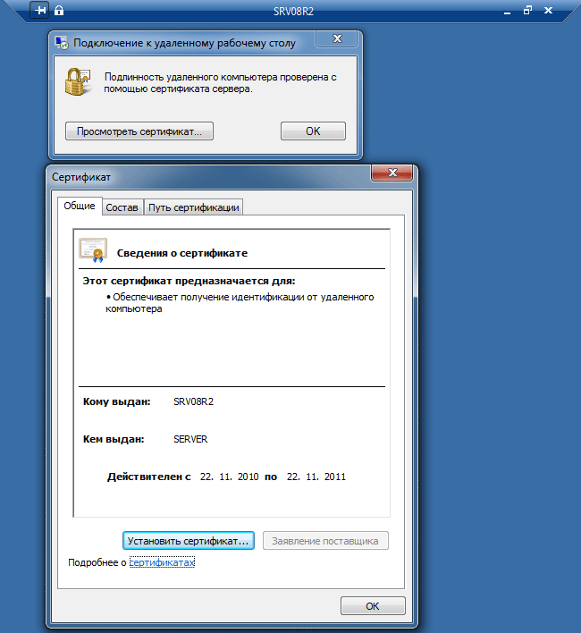 Установив сертификат ЦС можете пробовать подключиться, обратите внимание, что имя пользователя и пароль будет предложено ввести еще до создания RDP сессии. При успешном соединении обратите внимание на замок в заголовке окна, который свидетельствует о работе через SSL. Нажав на него можно просмотреть информацию о сертификате.
