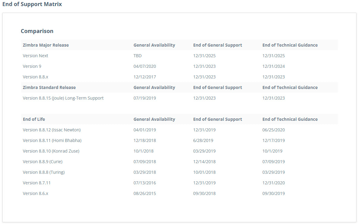 Сказать, что ситуация тревожная - это значит ничего не сказать. Очень многие организации используют в своей инфраструктуре Zimbra OSE и не все из них готовы переходить на коммерческую версию. Дополнительный повод для размышления предоставляет срок поддержки продуктов.