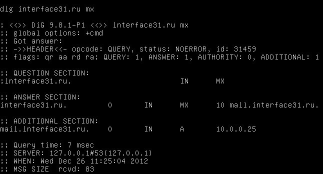В нашем случае имя почтового хоста будет mail.interface31.ru и А-запись данного хоста будет указывать на внешний интерфейс нашего роутера, сам почтовый сервер будет располагаться в локальной сети и иметь адрес 10.0.0.25.