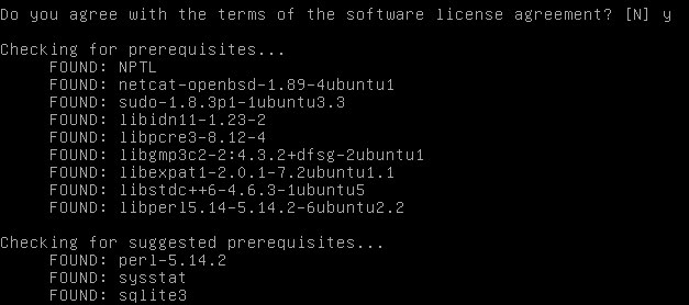 Соглашаемся с лицензионными соглашениями и, после проверки необходимых настроек и зависимостей, скрипт предложит вам перейти к установке, либо сообщит какого пакета вам не хватает. В этом случае надо выйти, доустановить зависимости и начать установку заново.