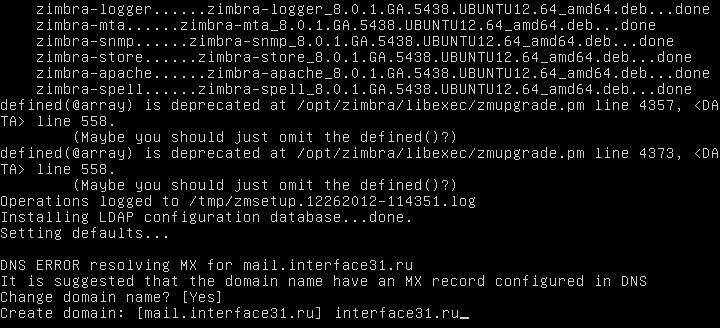 Следующий шаг - выбор устанавливаемых компонентов, в нашем случае принимаем значения по умолчанию и приступаем к установке. В конце установки вы можете получить ошибку DNS, связанную с тем, что Zimbra неправильно определила имя домена, в этом случае необходимо принять предложение инсталлятора и указать домен правильно.