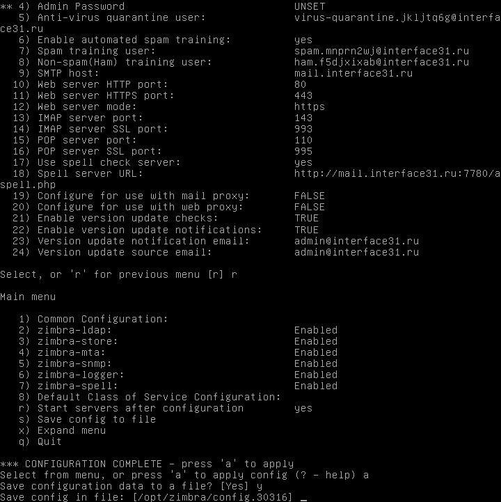 Здесь есть еще один неочевидный момент, при установке Zimbra в первый раз, многие получив на экран сообщение Save config in file: [/opt/zimbra/config. 30316] ждали и не могли дождаться конца операции, в то время как нужно подтвердить сохранение конфига в указанный файл нажав Enter.