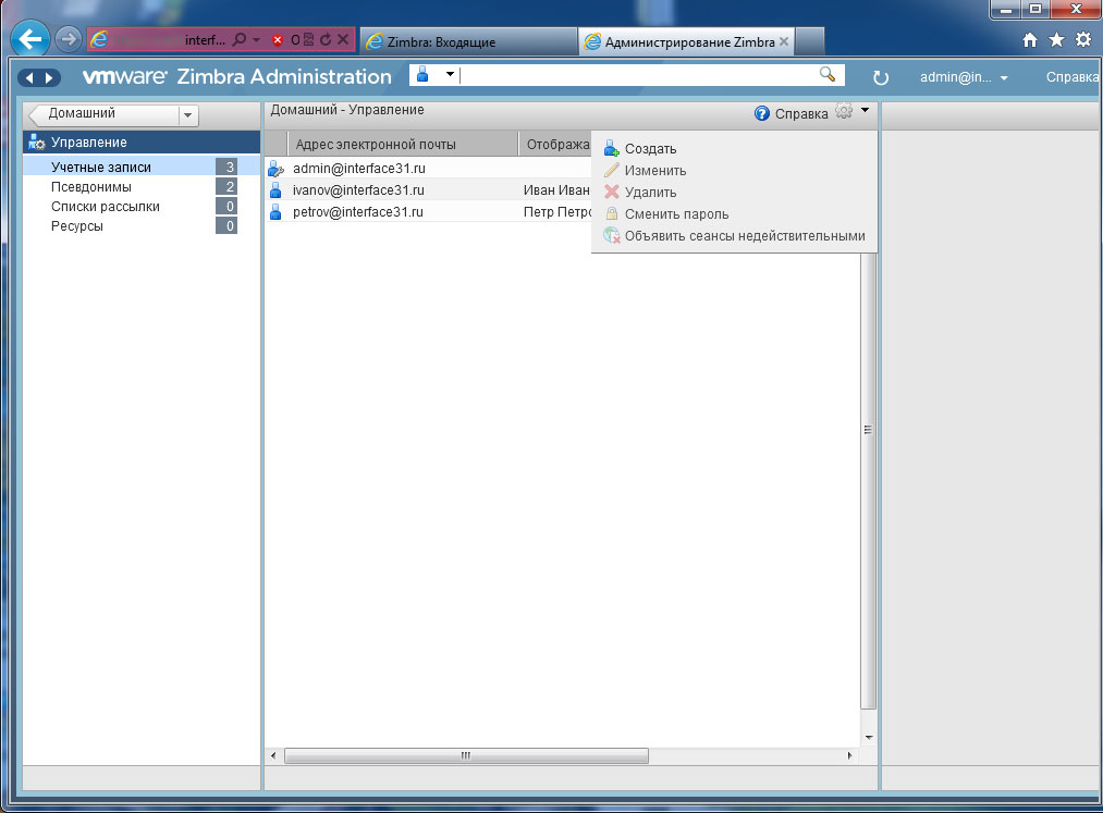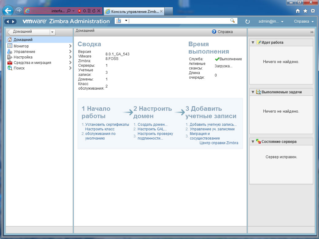 Панель администрирования будет доступна по адресу https://mail.interface31.ru:7071/zimbraAdmin, для входа используем имя admin и пароль заданный на этапе конфигурирования.