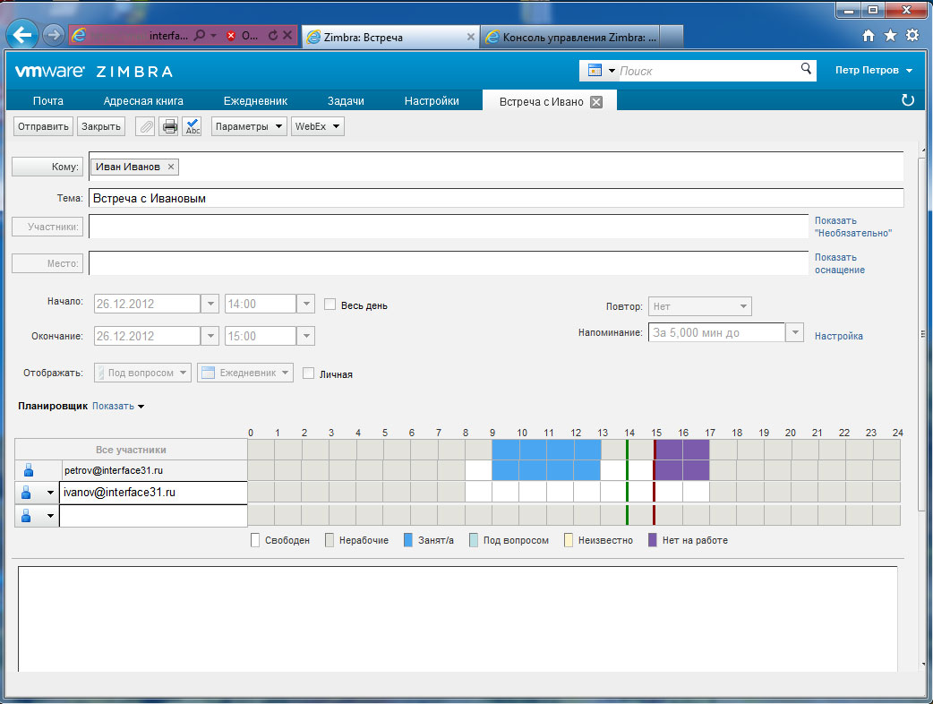Кроме почты в нашем распоряжении адресная книга, задачи и календарь, события которого можно легко пересылать коллегам.